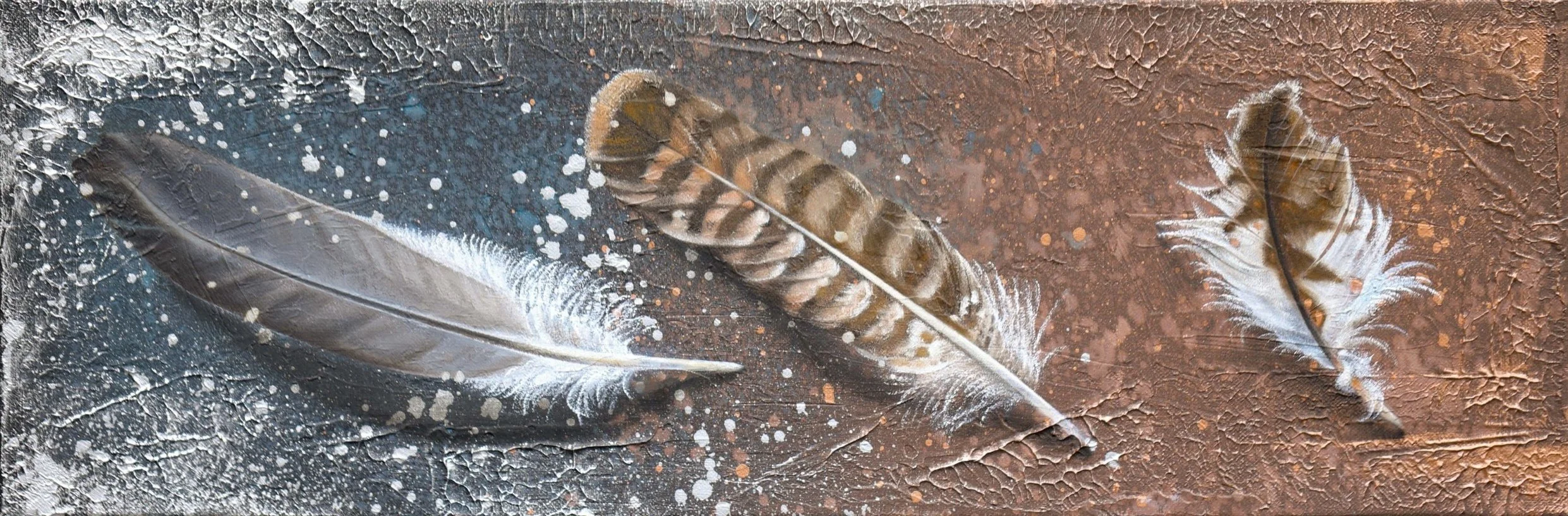 Die Federn scheinen noch voller Energie zu sein – voller Magie und Symbolik. Dieses Gemälde erzählt von der Leichtigkeit, Eleganz und dem Leben der Vögel, in grenzenloser Freiheit.